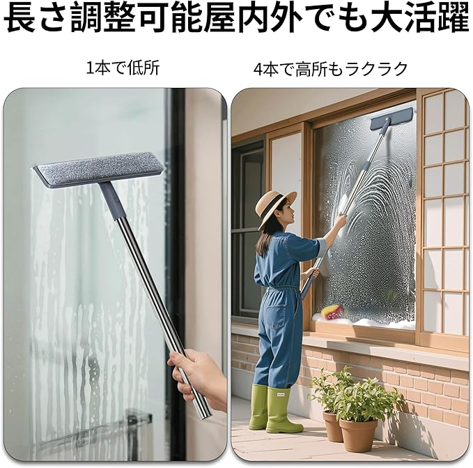 【ステンレス延長ポール+手持ち両用設計で高所も快適清掃】 4本継ぎのステンレス製ポールを採用し、最長153cmまで対応。ヘッドは手持ちでもポール装着でも使える設計で、高い窓も脚立なしでラクに掃除できます。