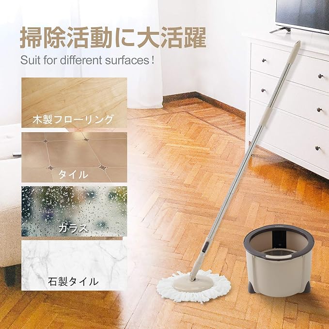 【セット詳細】:一槽式バケツ1個、クロス2枚、組立必要なハンドル3本、ヘッド1個。【材質】: クロスの真ん中にはマイクロファイバー、周りには綿糸素材を採用され、柔らかくて吸水性や耐摩耗性等にも優れていて床や壁に優しいし、特に木製の床面を傷つけずキレイに掃除できます。