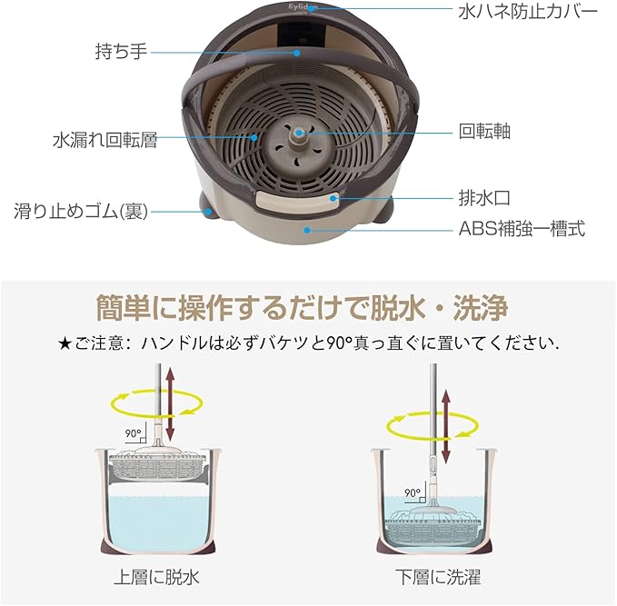 *【注意事項】:モップの洗浄や脱水が順調に進めるため、洗浄や脱水時、ハンドルは必ずバケツと90 真っ直ぐに置いてください。傾けて操作する場合は、洗浄や脱水時、モップヘッドが回転軸から脱落する可能性もあって、高速回転のスピード、洗浄や脱水の効果にも影響がありますので、予めご了承下さい。【品質保証】:本製品につきまして、ご不明点やご質問がございましたら、是非こちらのカスタマサービスまで、ご連絡を頂けると迅速に対応致します。お客様にご満足頂けるよう精一杯対応いたします。もし不良品あれば無償で良品と交換させていただきますので、ご安心ください。
