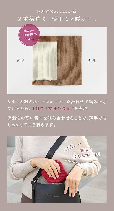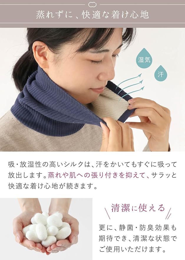 柔らかな質感と優しい光沢感のある綿糸を贅沢に使用しました。空気をよく含むので保湿効果が高く、シルクと組み合わせることにより吸汗放湿するため、蒸れることなく温かさを保ちます。