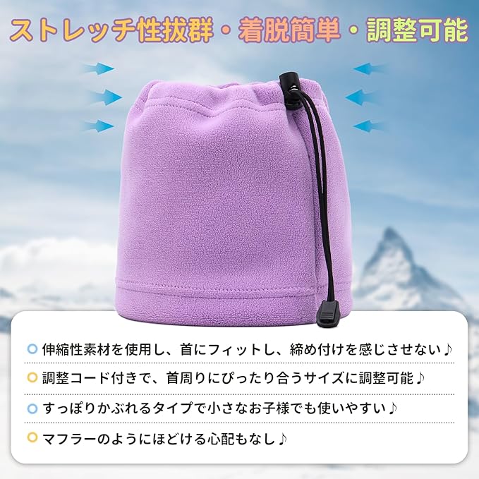【調整コード付き・快適なフィット感】優れた伸縮性を持つ素材を採用して、お子様の首にぴったりとフィットしながら、きつい締め付け感を感じさせない快適さが特徴です。調整コードを使えば、お子様の首周りに合わせてサイズ調整が可能です。すっぽりとかぶるだけの簡単設計なので、マフラーのように緩んでずり落ちる心配もなく、小さなお子様一人でも楽にご使用いただけます。