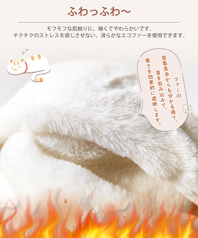 【猫の毛の手触り・細くてやわらかい】スヌードはまるで猫のようなモフモフな肌触りに、細くてやわらかいです。起毛部分が肉厚でボリュームがタップリ、肌触りもよく、チクチクしたせずに快適なスヌードです。スヌード レディースは極上の肌触りと風合いを実現した、チクチクのストレスを感じさせない、滑らかなエコファーを使用できます。柔らかなネックウォーマー レディースなので、敏感肌の方や、ウール素材が苦手な方にもおすすめします。