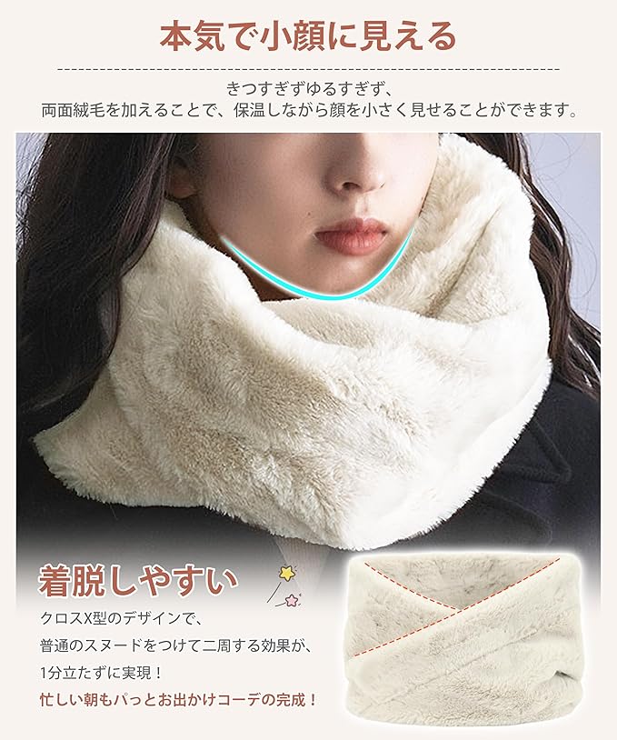 【本気で小顔に見える・着脱しやすい】クロスX型のデザインのスヌードで、普通のスヌードをつけて二周する効果が実現!顔が埋まるほどのボリューム&キチンと感のあるスタイリングが、1分立たずに出来上がります。スヌードはきつすぎずゆるすぎず、ふわふわ感のある両面絨毛を加えることで、保温しながら顔を小さく見せることができます。通勤・通学・送り迎えに忙しい朝もパっとお出かけコーデの完成!とっても便利なネックウォーマーで、かたちを整えなくてもスタイリング上手!