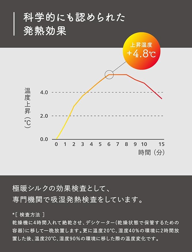 【糸から開発した、発熱する「極暖シルク」】日本の工場と協力して開発した極暖シルクは、身体から出る湿気や汗を吸収して熱に変えることで発熱します。 シルクの糸に特殊な加工を施しているため、選択しても発熱効果が落ちず、心地良い暖かさが続きます。 また、極暖シルクの効果検査として、専門機関で吸湿発熱検査を行い、科学的にも発熱効果が認められています。