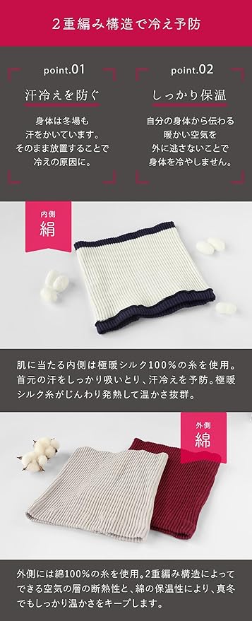【2重編み構造で冷え予防】 <●汗冷えを防ぐ…身体は冬場も汗をかいています。そのまま放置することで冷えの原因に。><●しっかり保温…自分の身体から伝わる暖かい空気を外に逃がさないことで身体を冷やしません。> [内側…シルク]肌に当たる内側は極暖シルク100%の糸を使用。首元の汗をしっかり吸いとり、汗冷えを予防します。極暖シルク糸がじんわり発熱して温かさ抜群。 [外側…綿]外側には綿100%の糸を使用。2重編み構造によってできる空気の層の断熱性と、綿の保温性により、真冬でもしっかり温かさをキープします。