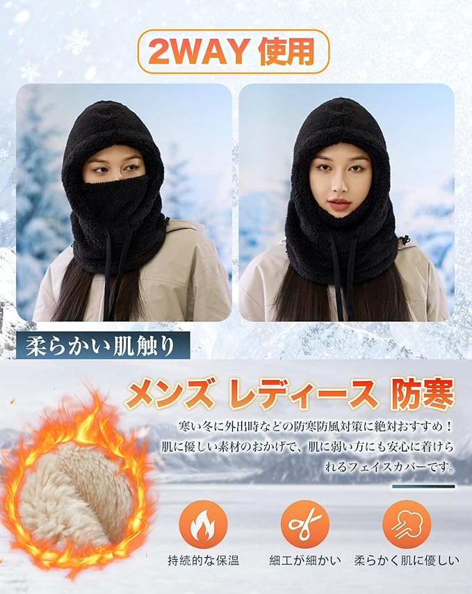 【肌に優しい素材】柔らかい肌触りで肌に優しい素材を採用しており、ふわふわで、チクチク感がありません。寒い冬に外出時などの防寒防風対策に絶対おすすめ!ふんわりネックウォーマーと首周りを包み込む軽い被り心地で、首周りや敏感な顔に当たってもちくちく感なく、暖かくて気持ち良く着けます。肌に優しい素材のおかげで、肌に弱い方にも安心に着けられるフェイスカバーです。