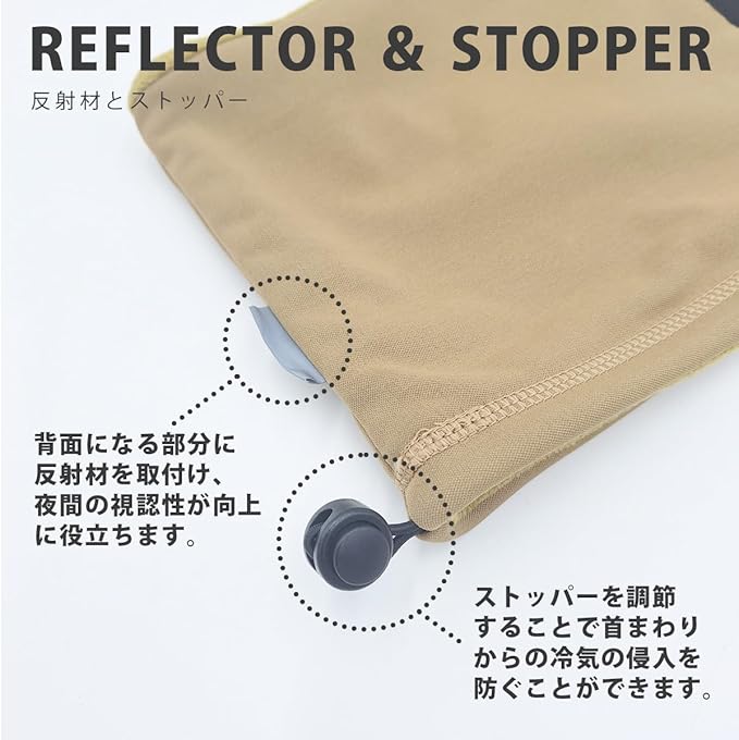 表生地の裏に防風フィルムをラミネート。生地の間に防風フィルムを挟みこむことで冷気の通過を防ぎます。背面になる部分に反射材を取付け、夜間の視認性向上に貢献します。また、付属のストッパーを調節することで首まわりからの冷気の侵入を防ぎます。インナーには肌触りのいいフリースを使用していますシンプルで落ち着いたデザインで、アウトドアやスポーツ、カジュアルな場面など様々な場面で活躍してくれます。サイズ:縦23cm 横30cm(ユニセックスフリーサイズ)