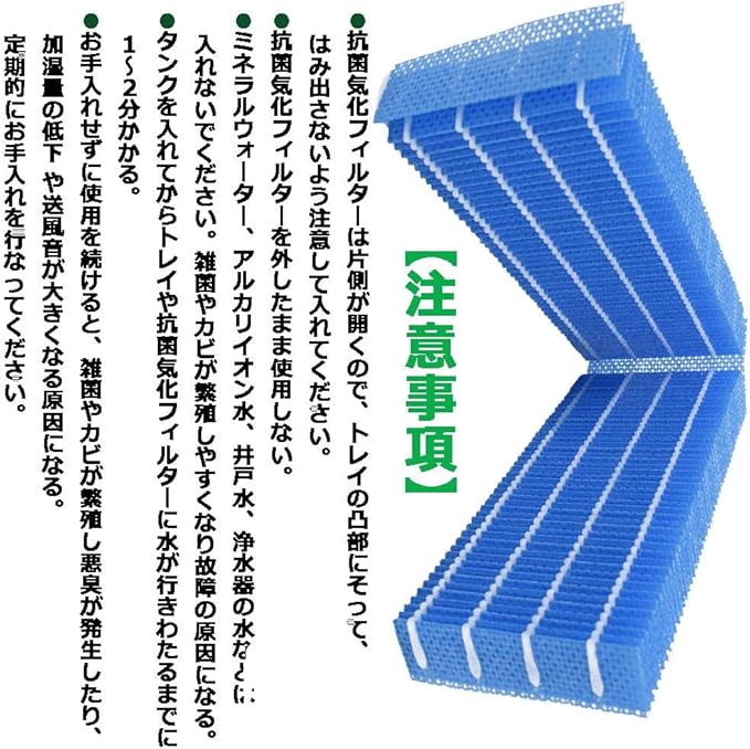 【お手入れの目安】1カ月に1回。また、5シーズンを目安に新しいものと交換してください。お手入れや交換をせずに使用を続けると、雑菌やカビが繁殖し悪臭が発生したり、加湿量の低下や送風音が大きくなる原因になる。