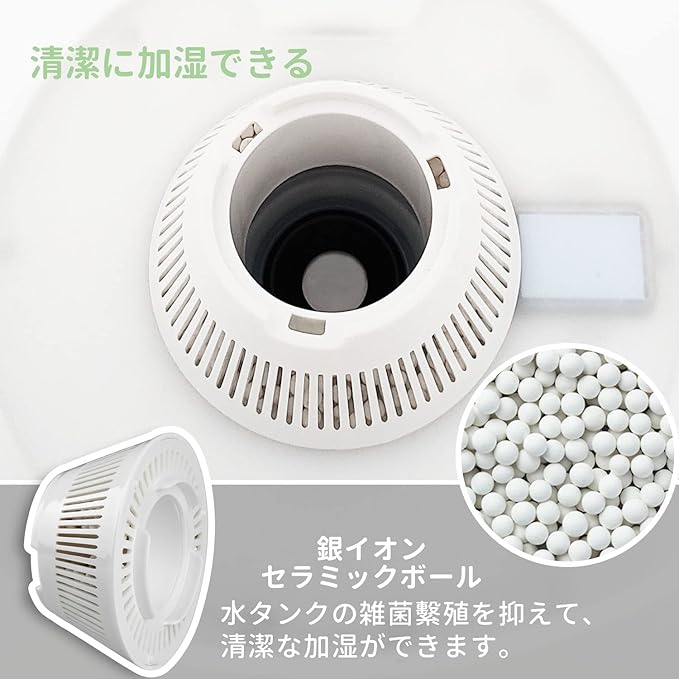 【銀イオン(Ag+)セラミックボール】多くの製品で広く使用されている銀イオン(Ag+)は雑菌の増殖を大幅に防ぐので、雑菌による腐敗臭を抑止します。清潔な水で加湿できます。