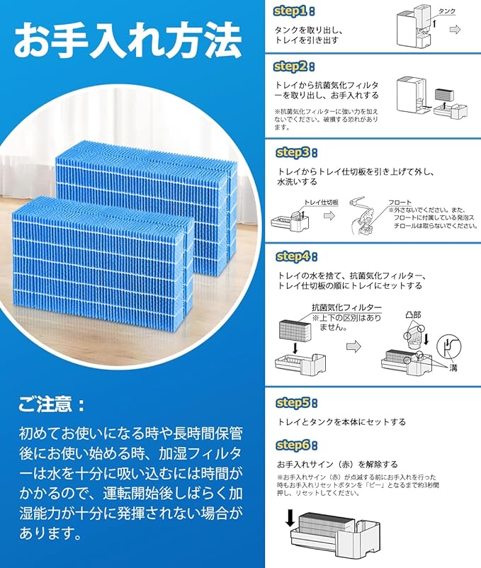 【お手入れの目安】2 週間に 1 回。加湿器フィルターの寿命を確保するため、定期的に洗浄してください。※吹き出す空気がにおったり、加湿量が少なくなってきたときもお手入れしてください。お手入れせずそのまま使用すると、本体内部が高温になる・加湿量が低下する・異臭がするなど故障の原因になる。
