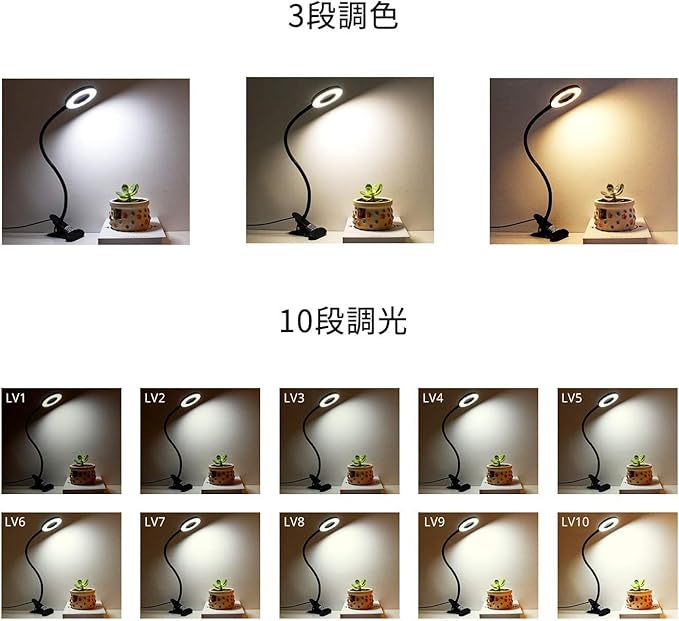【3段調色・10段調光・自動消灯】昼光色→白色→電球色の3色切り替え機能付きベッドクリップライト。10段階の調光、明るさを切り替え、目的に合わせて10段階の調光が選べます。調光・調色とも電源OFF時でも記憶されます。電源スイッチはボタン式で、タッチセンサータイプと比べて、押す時に実感があります。3秒長く押しますとスイッチが点滅し始め、1分後にはライトが自動消灯します