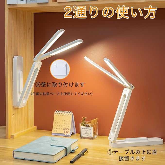 【多目的テーブルランプ】ledスタンドは机の上に置くだけでなく、吊るして省スペースにすることもできます。 (ハンギングベースが付属し、ledライト 照明は壁に取り付けることができます。)軽量で携帯性に優れ、手のひらに収まるように折りたたんで簡単に持ち運ぶことができ、家庭やオフィスでの使用に最適な充電式デスクライト ledです。 ワイヤレスで使えるので非常用照明としても使えるベッドライト。