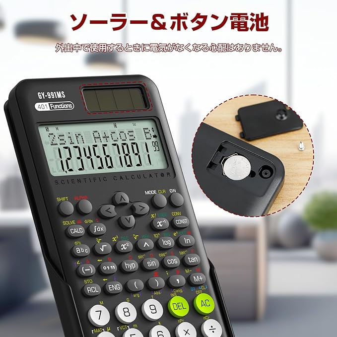 ⑤【ソーラー充電 ボタン電池】ボタン電池の交換とソーラー充電に対応する関数電卓です。電源が切る時にボタン電池を手軽に交換し、電卓はすぐに満電状態になります。便利性が優れています。また、外出中で突然電気がなくなった場合でも、ソーラーパネルで電卓を充電することができるので、電卓が使えなくなる心配はありません。
