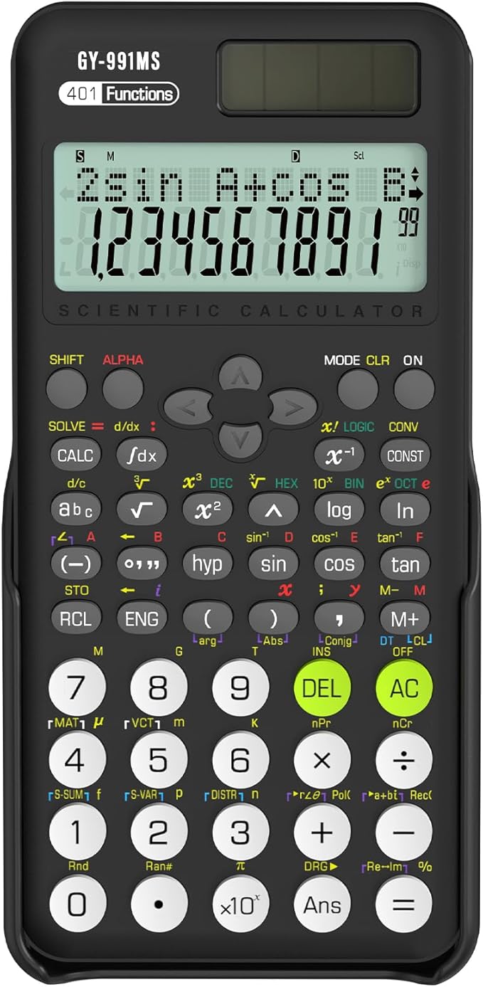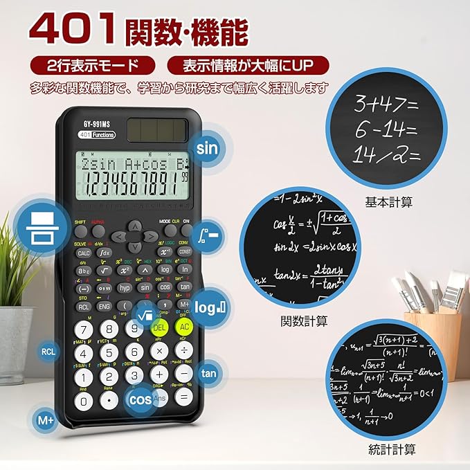 ①【多機能関数電卓】401関数・機能を扱う関数電卓です。基本計算から複雑な関数まで対応できます。数字も記号もはっきりと映され高精細な液晶ディスプレイも搭載します。電気・土木・建築系のお仕事に就いている方や、関数電卓が必要な理系大学生にぴったりです。多彩な関数機能で、学習から研究まで幅広く活躍します。