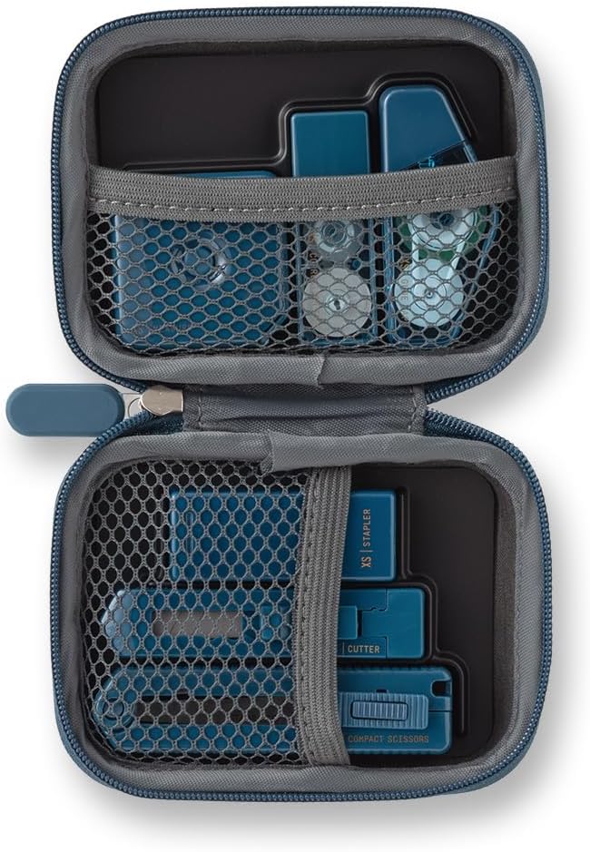 まとめて保管・携帯しやすいように、ハサミ、ホッチキス、修正テープ、テープのり、カッター、メジャーの6アイテムを軽くて丈夫な専用ケースに収めました。