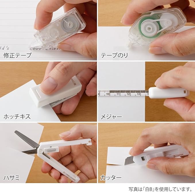ハサミ・ホッチキス・修正テープ・テープのり・カッター・メジャーの6点が専用ケースにセットされています。