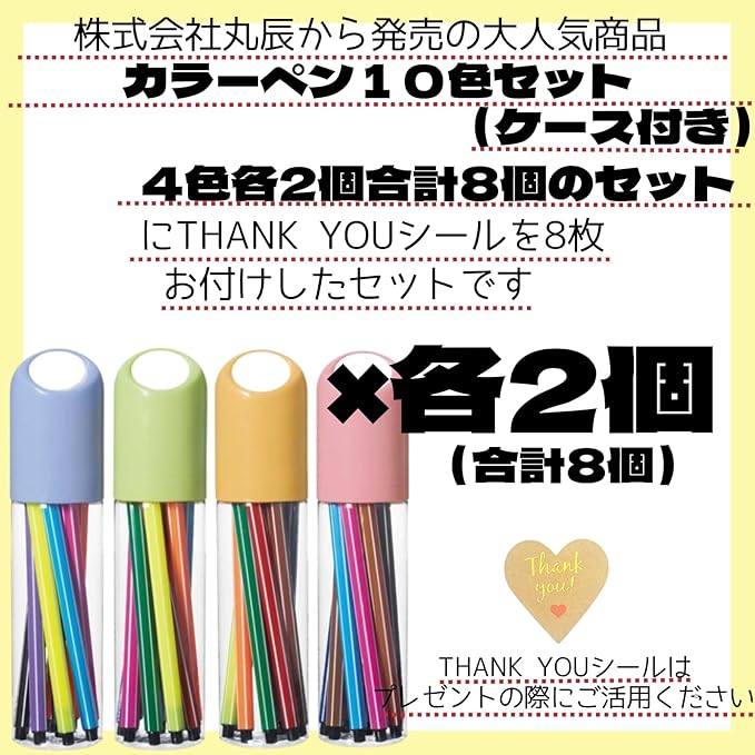株式会社丸辰から発売の大人気商品ボトル入りカラーペン10色セットがリニューアルして登場です♪ こちらのセットは「ボトル入りカラーペン10色セット」4色各2個ずつ合計8個のセットに贈り物としてご利用される際にお使いいただけるオリジナルthank youシールを商品の数だけお付けしたセットになります。