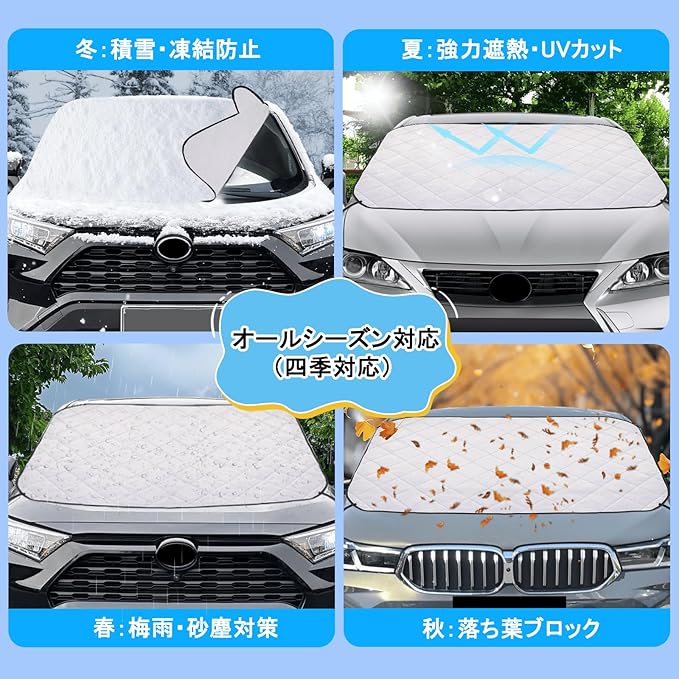 【四季対応・年間保護】冬は積雪・凍結防止、夏はUV・高温対策、春は風砂や花粉、秋は落葉や鳥フン対策として、1年を通して活躍。季節ごとに異なる環境から愛車を守り、凍結防止カバーとしても多機能な役割を果たします。1枚でオールシーズン対応できる、コストパフォーマンスに優れた一品です。