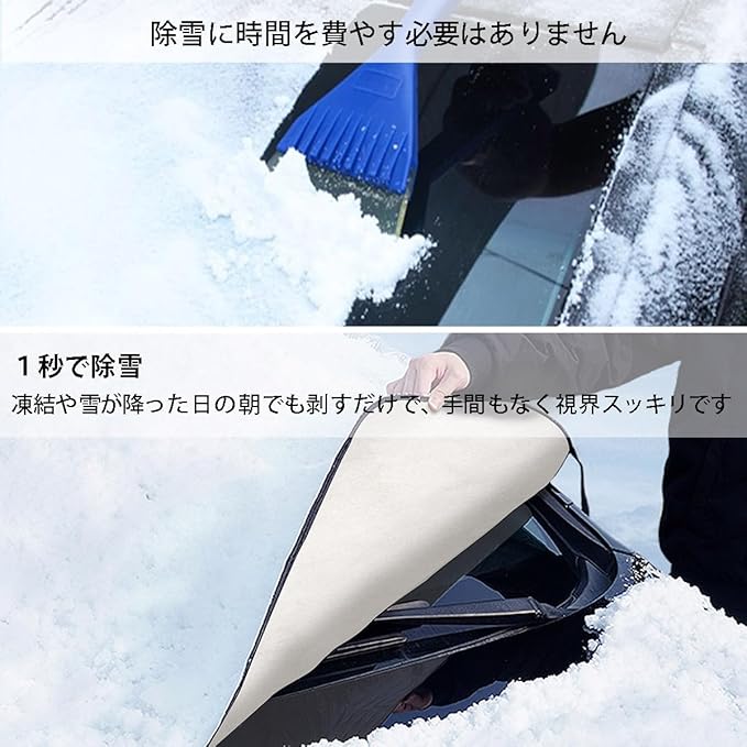【凍結防止・積雪対策】フロントガラスカバーを外してだけで積もった雪を簡単に取り除きます。朝の出発は楽になり、通勤時間を短縮できます。非常に厚くて大型フロントカバーなので、ワイパーとフロントガラスだけでなく、両サイドの部分ガラスでも覆えます。紫外線を遮断し、ワイパーとフロントガラスの使用寿命を効果的に高めて、夜の露もしっかり防ぎます。