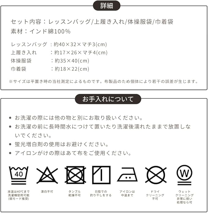 サイズ:レッスンバッグ:約W40 D3 H32/上履き入れ:約W17 D4 H26/体操着袋:約W35 H40/給食袋:約W18 H22/ネームタグ付き/液温は40 ℃を限度とし、洗濯機で非常に弱い処理が出来る