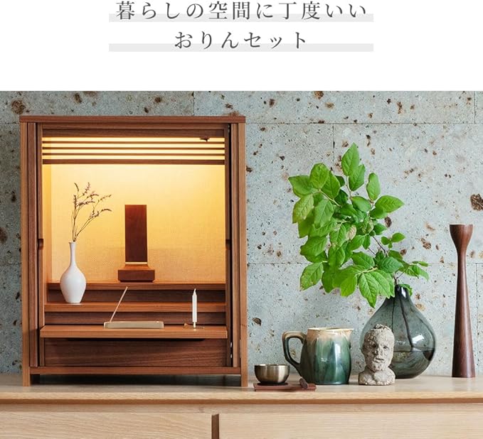 "木"で揃えることができるおりんセット。りん台とバチは、高級家具にも使用されることが多いウォールナットを使用。