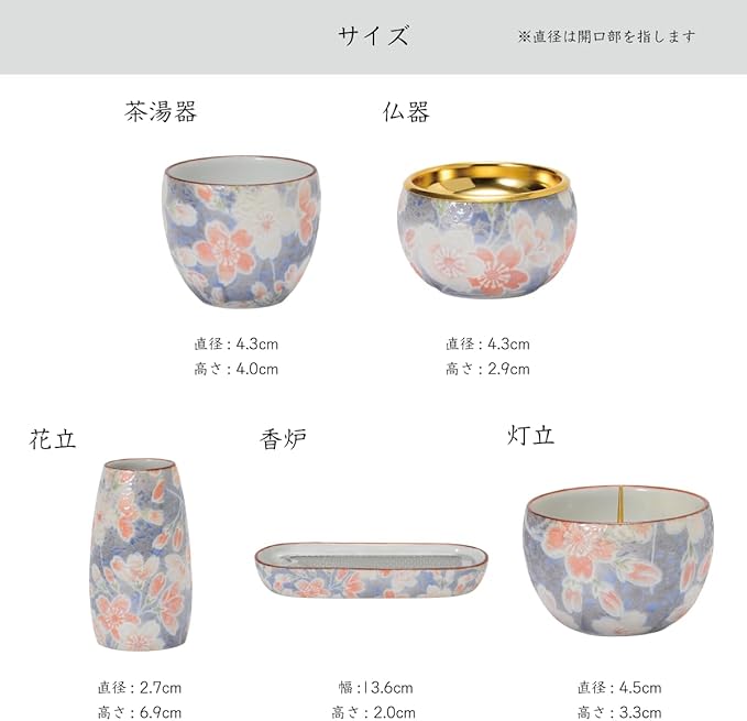 花立、灯立、寝かせる線香皿、茶湯器、仏器がセットになっています。おりんや香炉など、同一の柄のシリーズも取り揃えているため、統一感のあるお仏壇を演出できます。