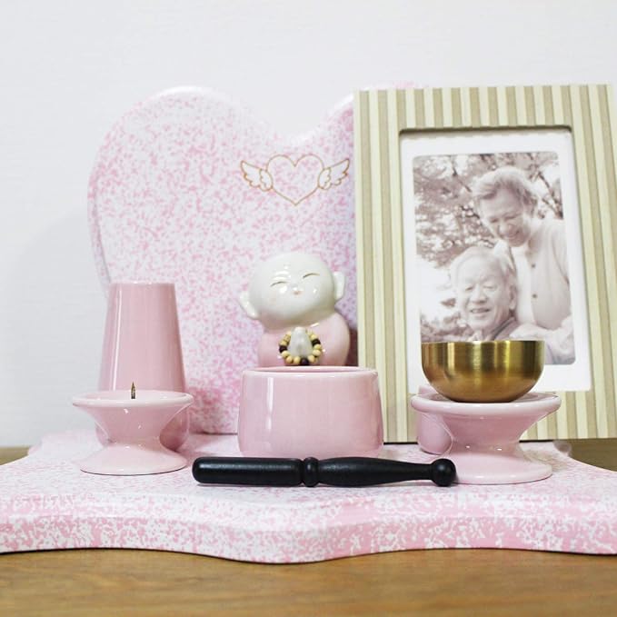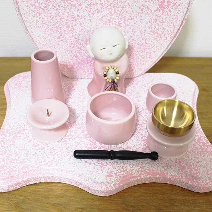 仏壇:幅約30cm 高さ約19cm 奥行き約19cm / 花瓶:高さ8.2cm 直径4.7cm / 水入れ:高さ3.2cm 直径4cm / ろうそく立て:高さ3.1cm 直径5.1cm / 香炉:高さ4.2cm 直径6.2cm / りん台:高さ約3.1cm 直径約6cm / りん台は、おりんを取りはずすことで供物台としてもご利用いただけます。