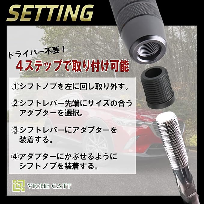 3種類のアダプター(硬質プラスチック)が付属しているので、幅広い車種に対応します。 (トヨタ/スバル/スズキ/ダイハツ/ニッサン/マツダ/ミツビシ/ホンダ) ねじ込み式で設置が簡単。国産車であれば付属のアダプターのみで取り付けが可能です。 人気のスポーティーデザインがかっこいい。 運転の際にシフトレバーは必ず触り目に入るもの、普段の運転に遊び心をプラスしましょう。 また、助手席からもバッチリ見えるシフトノブをおしゃれにカスタムすることで同乗者への印象もアップさせられます。