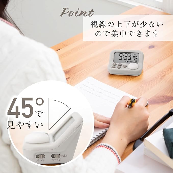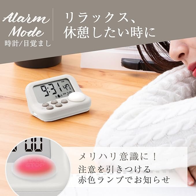 【使いやすいポイント】 視認性の良い斜め45度の画面表示を採用。座った姿勢で見た時に画面がちょうど見やすいよう設計されています。ボタンも画面の前についており、操作がしやすくなっています。最大セット時間99時間59分50秒と超長時間なので色々な作業にも対応します。アラームは「無音」に切り替えることができるので静かな場所でも使用できます。カウントダウン終了後、自動でカウントアップを始める機能付き。特に試験勉強におすすめです。