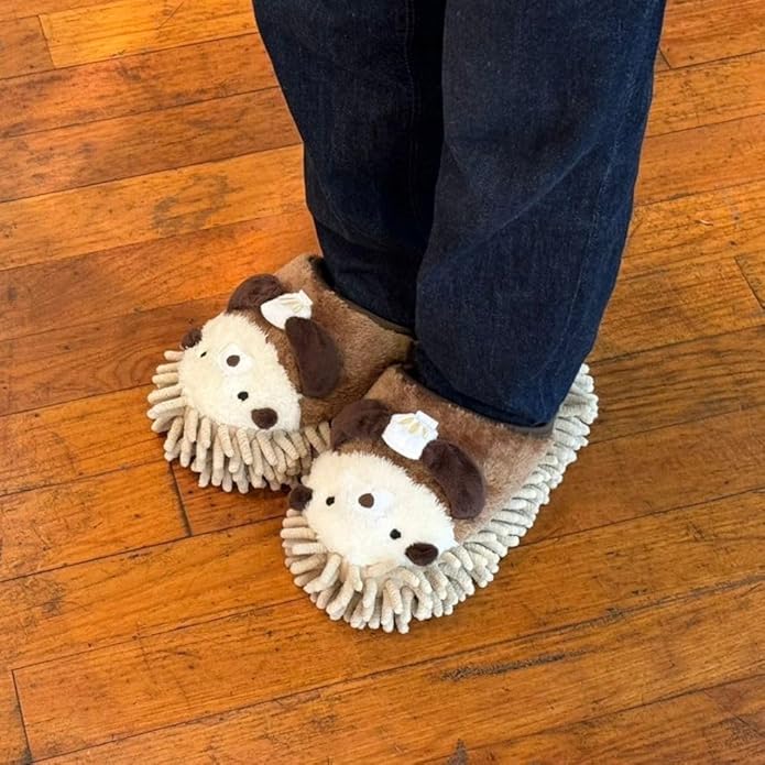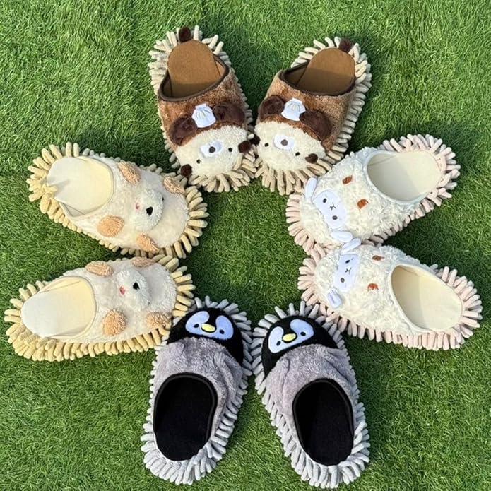 【かわいらしいアニマルモチーフ】スリッパを履いた時に動物たちと目が合うようなデザインになっています。足を動物たちがぎゅっとハグをしてくれる、ぬいぐるみのようなかわいらしいお掃除モップスリッパです。