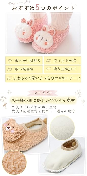 【もこもこボア素材で暖かいルームシューズ】寒い冬でも赤ちゃんの足元をしっかり保温!もこもこのボア素材で、室内でも快適な防寒アイテムです