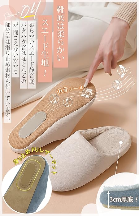 【独特な靴底デザイン:超静音&滑り止め&床を傷つけない】 柔らかいスエード生地を使用した靴底は、驚くほど静音性に優れ、足音を気にせず歩けます。また、床を傷つける心配もありません。さらに、防滑パッド付きで、濡れた床でも滑りにくい仕様。冬の寒い季節でも快適で安全に使える、実用性抜群のスリッパです。