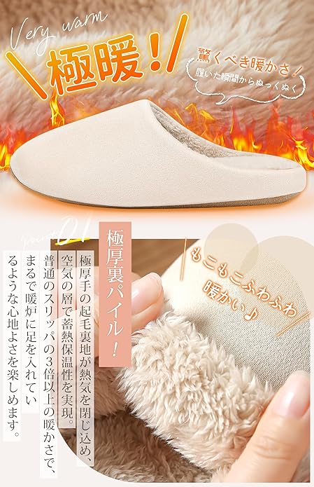 【驚くほどの暖かさ!極厚裏パイル】見た目もかわいいふわふわのインソールは、足を包み込み、裏地は極厚手で起毛、熱気を内側に閉じ込め、空気の層ができることで蓄熱保温性は普通のスリッパの3倍以上。冷えやすい足元をしっかり温め、まるで暖炉に足を入れているかのような心地よさを感じられます。柔らかくて暖かく、心も体もぽかぽかになる、優しさに溢れたルームシューズです。