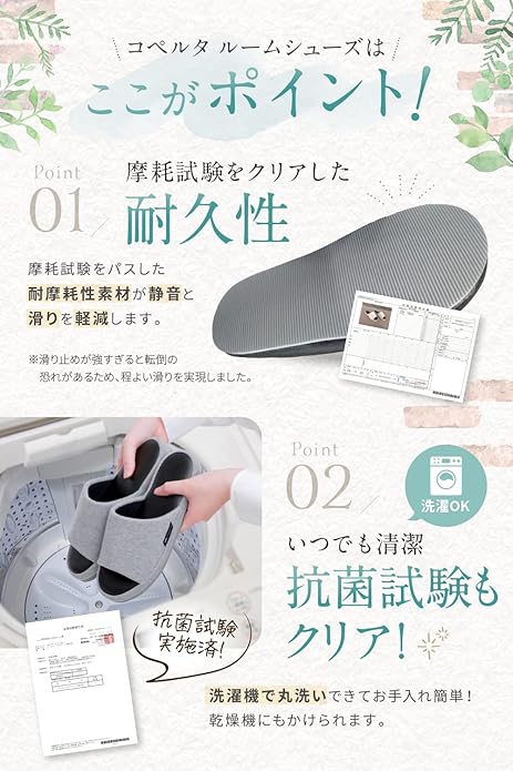 【防臭・抗菌加工で衛生的】 抗菌防臭加工を施した素材を使用し、嫌なニオイを防ぎます。素足で履いても快適で、通気性が良いため蒸れにくい仕様。長時間の使用でも快適さをキープします。ルームシューズ おしゃれ でありながら清潔感も保てるため、毎日の室内履きに最適です。さらに、スリッパ メンズ レディース 兼用で、家族全員で使用できるのも嬉しいポイント。