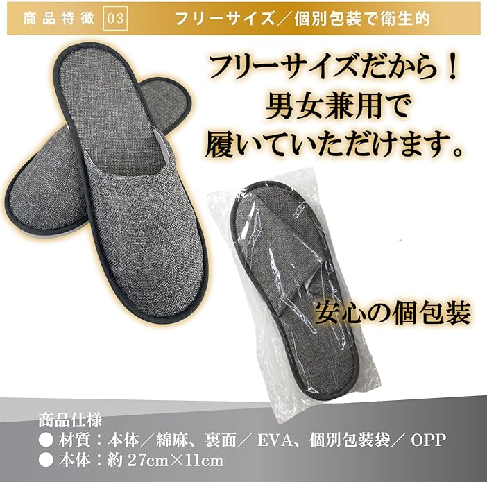 【多用途】ホテル・旅館・病院・夜行バス・オフィス・飛行機・住宅展示場・モデルルーム・エステサロン・人間ドック・イベント会場・学園祭・文化祭・避難所等の備えに活躍。コロナ禍の今に大変活躍しています。ハイクラス感を出したいというご要望にお応えできる「極上の使い捨てスリッパ」です。