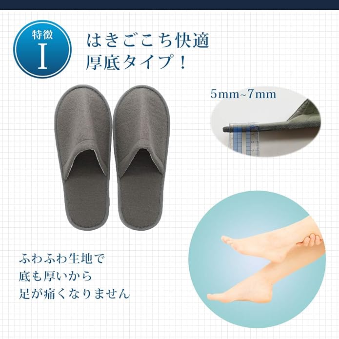 【ふわふわで足が痛くならない】裏面は滑りにくいエンボス加工がしてあり、ホテル等で快適に利用できます。