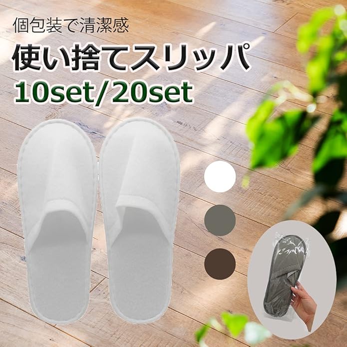 【特徴】3色展開の個包装された使い捨てスリッパ。さわり心地の良いふわりとした生地を使用し、足裏に負担のない厚底タイプ。前閉じ仕様で歩行時に衛生的であり、避難所・病院などでも気兼ねなく利用できます。汚れの目立たないカラーも展開。