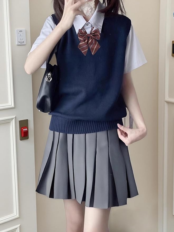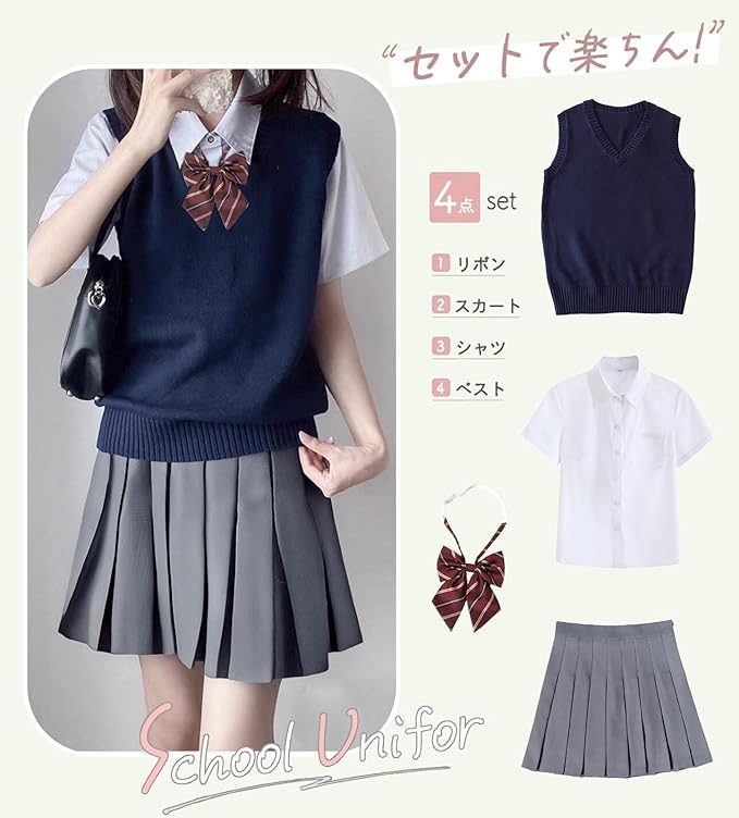 [KALAOK] 女子制服 コスプレ 男子制服 スクールベスト 4点セット ニットベスト シャツ プリーツ ズボン リボン Vネック 学生服 高校生 春夏秋冬 半袖 無地 学園祭 文化祭 入学式 卒業式 | etshop