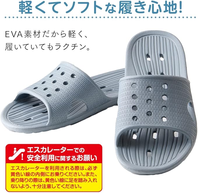 穴あきソールだから水が抜けて乾きやすい! ベランダ履きに便利です。また、EVA素材だから軽くて履いていてもラクチン。