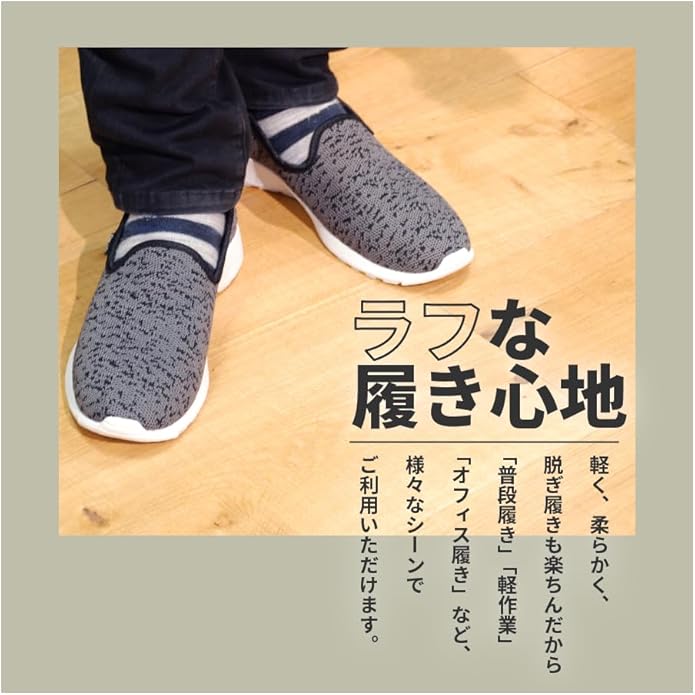 ニット素材で通気性がよく、柔らかでラフな履き心地の軽作業靴。履いている感覚がないほど柔らか。かかとを踏んで履いても型崩れしないように補強もしてあります。室内作業で床に色がつかない白い靴底を採用。