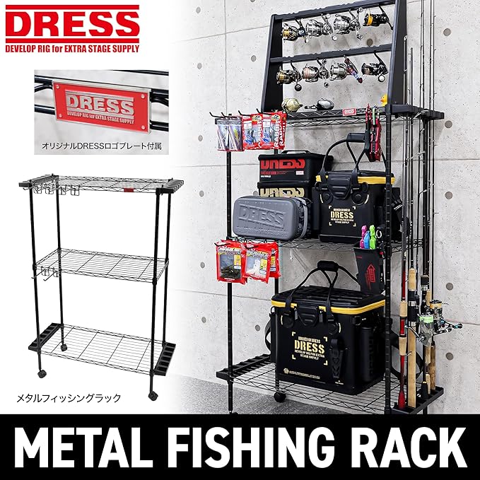 ●ワイヤーフックにラインのボビンを吊ることも可能 ●キャスター付属。2個はストッパー機能付き ●オリジナルDRESSロゴプレート付属 ■セット内容: ・ロッドホルダー(上下) 2 ・キャスター 4 ・シェルフ 3 ・ワイヤーフック 6 ・DRESSロゴプレート