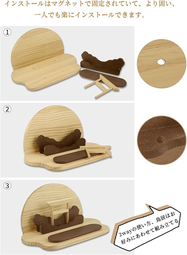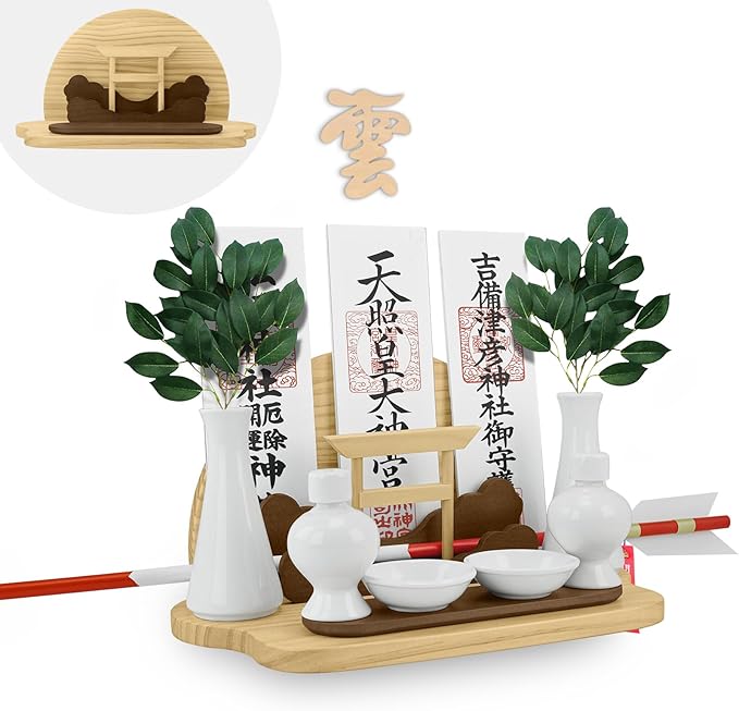 【コンパクトで多機能|思いのままに祀る】コンパクトサイズながら、神具・榊・破魔矢はもちろん、旅先で求めたお守りや御朱印帳など、大切なものを納めるのに十分な空間。破魔矢は、お好みで鳥居内に立てるのはもちろん、横に勢いよく飾ることも可能(専用スペースを考慮した設計)。裏面フラット&軽量設計で、付属の壁掛け金具(穴の目立たない小針ピンフック)を使え壁掛けも簡単。置き型としても安定感抜群です。