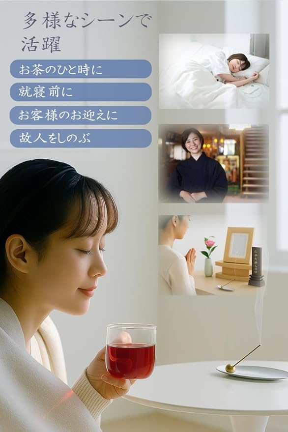 ■ 本数 約100本 容量 25g 長さ 10㎝ 燃焼時間約20分 ■ けむり少なめ・天然素材のやさしさ 合成香料は一切不使用。天然香料のみを用いたお線香なので、香りに敏感な方やご高齢の方にもおすすめです。 煙も控えめで、お部屋に香りがこもりにくい仕様です。 ■ 毎日の暮らしに“整う”香りを 疲れた心を解きほぐすように。 日常のなかに、ふと訪れる安らぎの時間をお届けします。 読書、瞑想、ヨガ、お仏壇へのお供えなど、さまざまなシーンでご愛用いただけます。