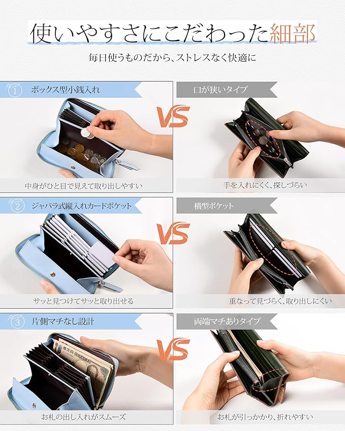 【使いやすさの違いを実感】一般的な財布と比べて、開きやすさ・見やすさ・取り出しやすさが格段にアップ。中身を一目で確認できる広めのマチと、動線を考えたポケット配置で、支払いもスムーズに。使って初めて分かる、細部まで計算された使いやすさです。