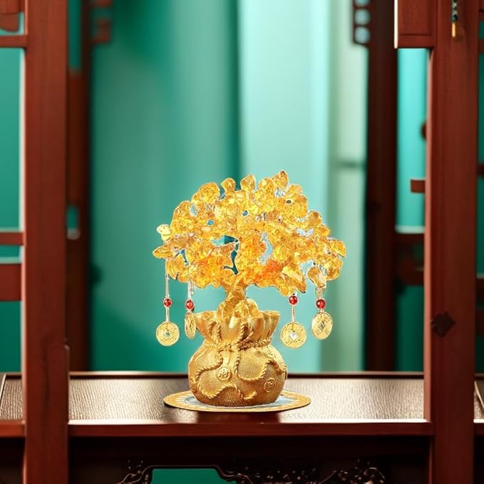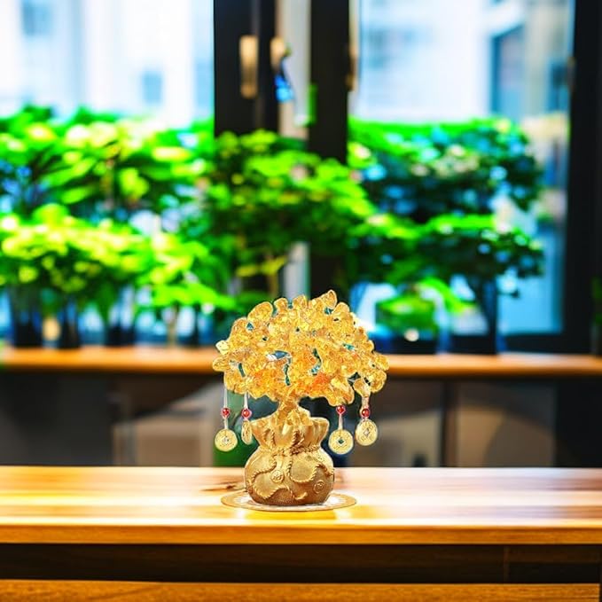 招財樹の葉は黄水晶です。黄水晶は知恵と喜びのシンボルで、自信と希望を与えてくれるエネルギーがあると考えられています。黄水晶は富の石の美称で、商売繁盛,事業の発展を安定させ、金運をもたらすと言われています。招財樹はサービス系のビジネス会社や事業者に欠かせない財宝です。