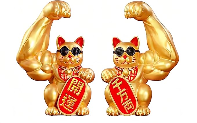 マッチョ招き猫は、サングラス姿もクール。筋肉と血管もリアルに再現、かっこよさと味のある個性的な表情もナイス。元気満載の招き猫は、大きな福をきっと呼びます。