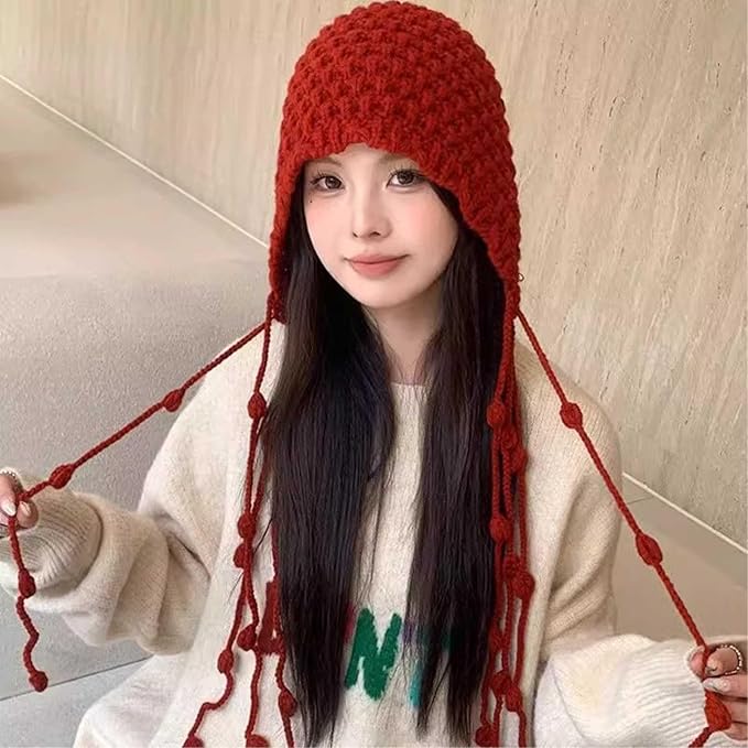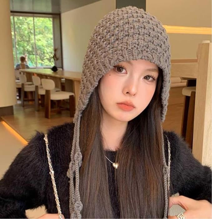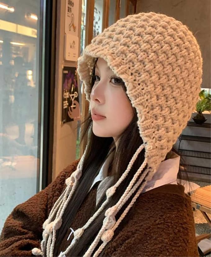 [Nestkanina] レディース ニット帽 あったか かわいい バブーシュカ タッセル ポンポン紐付き ざっくり ローゲージ ニットキャップ 秋冬 厚手 フワフワ もこもこ あたたかい 帽子 防寒 保温 小顔効果 HAT049 | etshop