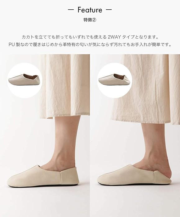 カカトと立てても折ってもいずれでも使える2WAYタイプとなります。軽すぎず重すぎない重さと固い床でも十分なクッション性で履いていても疲れません。