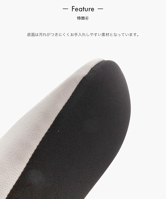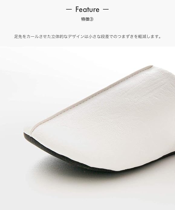 PU製なので履きはじめから革特有の匂いが気にならず汚れてもお手入れが簡単です。 底面を柔らかく仕立てていることで下階へ響くバタバタという足音にも配慮しました。 足先をカールさせた立体的なデザインは小さな段差でのつまずきを軽減します。