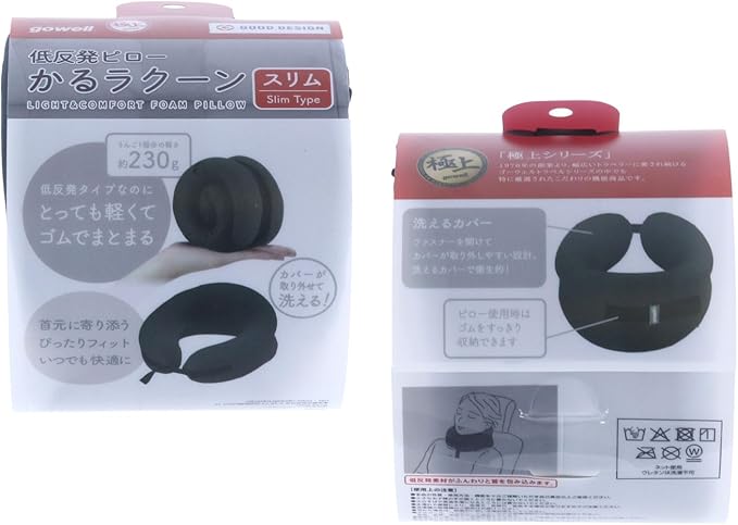【低反発ピロー かるラクーン スリムタイプが登場!】 gowellの「低反発ピロー」は、「移動中、首が疲れて眠れない…」「旅行に持っていきたいけど、かさばるのが嫌…」そんなあなたの悩みを解決する、究極のトラベルネックピローです!素材には、もっちりとした低反発ウレタンを採用。あなたの首元にぴたっと寄り添い、まるでオーダーメイドのようにフィットします。包み込まれるような心地よさで、長時間座っていても首への負担を軽減。快適な眠りへと誘います。重量はりんご1個分の重さと同じ、約230gなので持ち運びにも便利です。さらに、付属のゴムバンドでくるっとまとめてコンパクトに収納可能。バッグの中でもかさばらず、使いたい時にサッと取り出せます。飛行機や新幹線、バスでの長距離移動はもちろん、オフィスでの休憩時間や、自宅でのくつろぎタイムにも最適。いつでもどこでも、あなたの快適な移動をサポートします。「かるらくーん」と一緒に、身軽で快適な旅に出かけましょう!※梱包形態とパッケージの色味が異なる場合がございます。